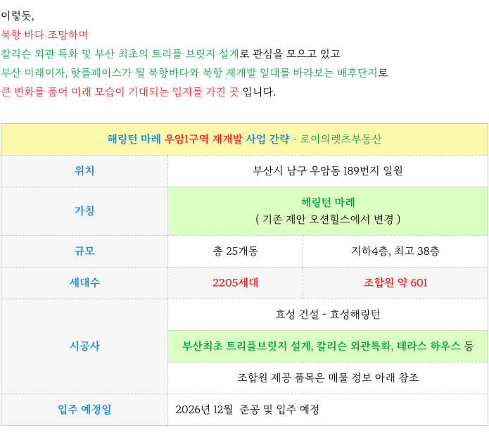 안녕하세요 로이의렛츠부동산 ( JAK 제이에이케이 부산 ) 입니다. 오늘은 우암1구역 재개발 해링턴 마레...