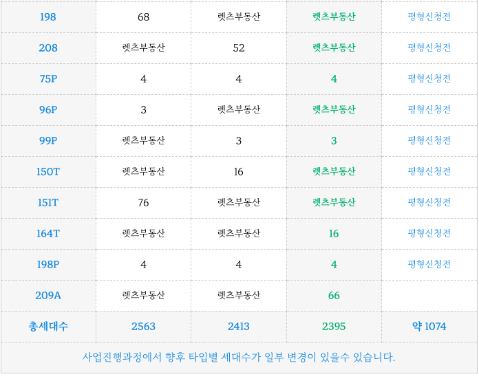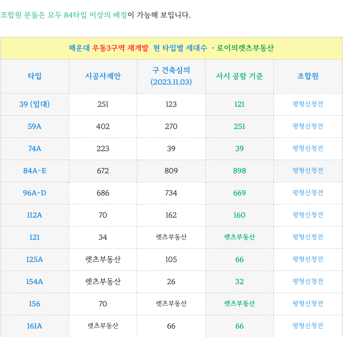 우동3구역 각 타입별 세대수 소개해 드리겠습니다.