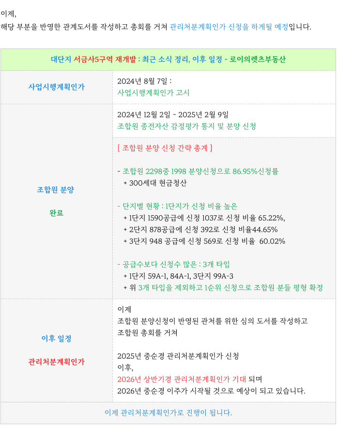 서금사5구역 재개발 은 조합원 분양신청을 마감하고 관리처분계획인가로 진행 됩니다.