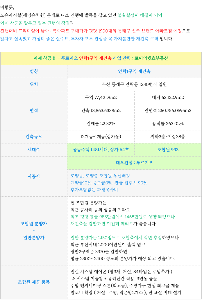 동래구 안락1구역 재건축 : 최저 매물 & 최신 세명 유치원 해결 소식