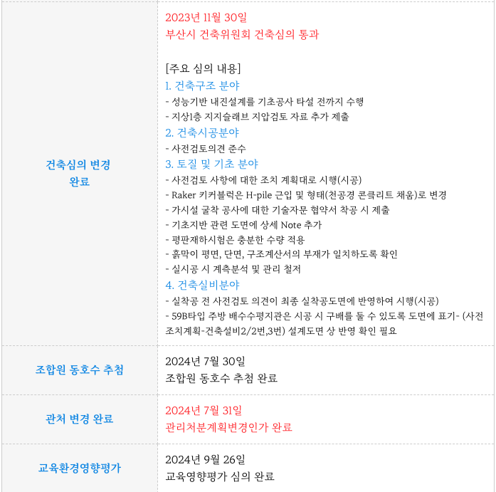 내부 설계 변경 등에 대한 내부 이견과 세명유치원등 이슈로 다소 긴 시간 지연이 있었습니다.
