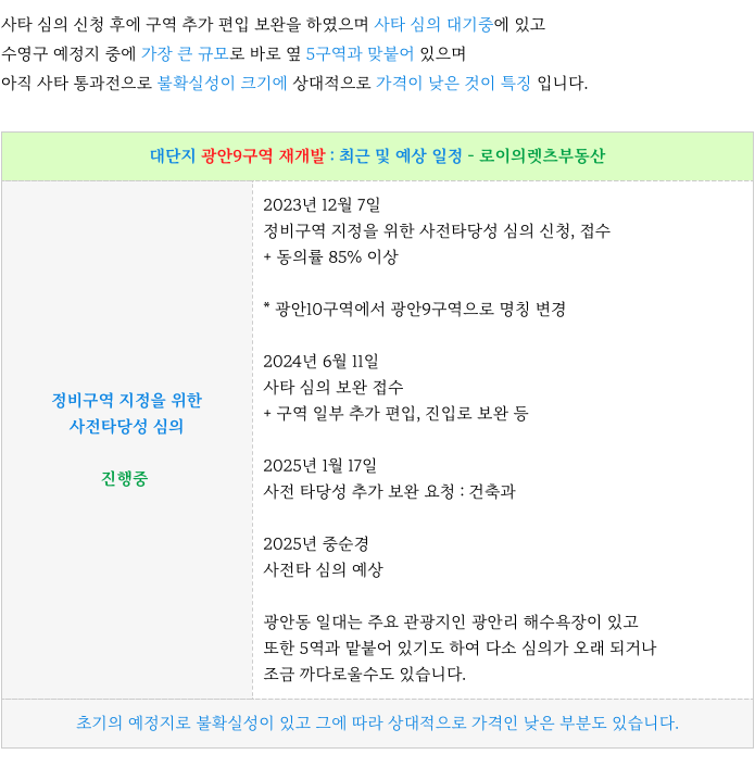 사타 심의 대단지 광안9구역 : 최근 진행과 예상일정 그리고 소액 매물 소개해 드리겠습니다.