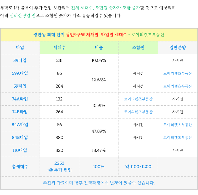 광안9구역 재개발 현재 추정 각 타입별 세대수 소개해 드립니다.