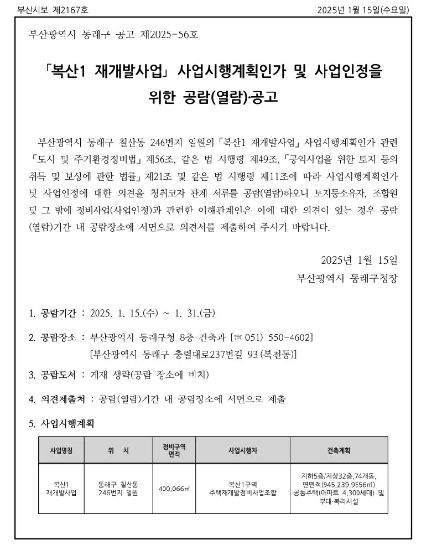 - 2025년 1월 30일 사업시행계획인가 공람을 마쳤고