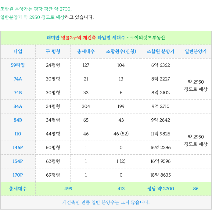 3. 계획된 각 타입별 세대수 + 분양가 : 명륜2구역 재건축 :