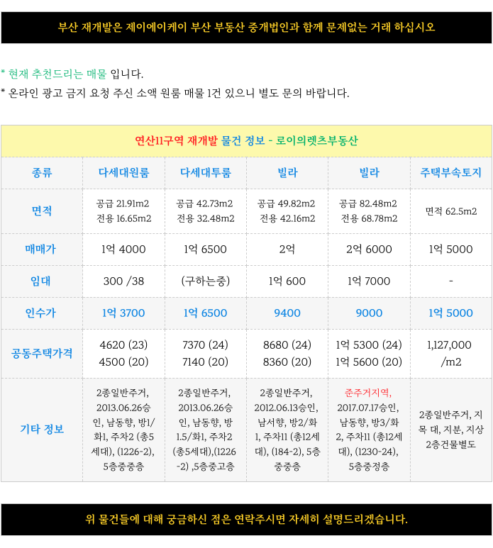연산11구역 재개발 : 소액 매물, 종류별로 소개해 드리겠습니다.