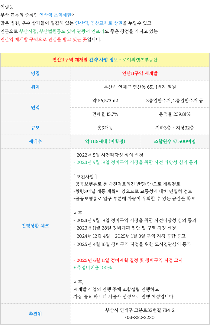 5. 재개발 사업 주요 특징 재 정리 : 연산11구역 재개발 :