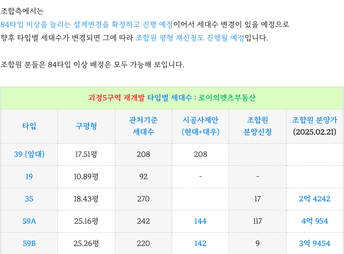 1. 괴정5구역 재개발 : 타입별 최저 매물 소개 :