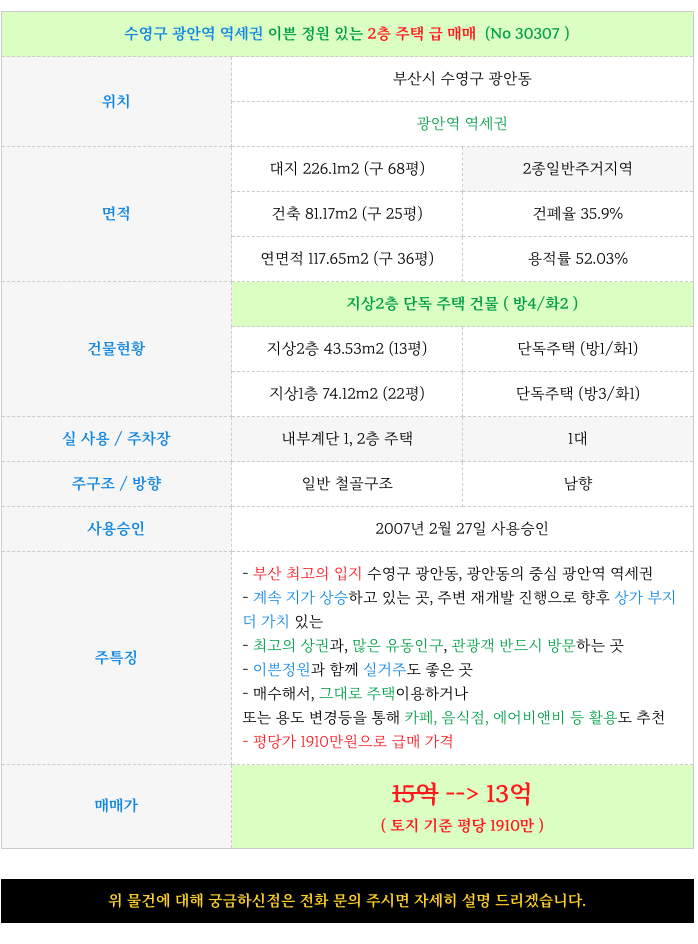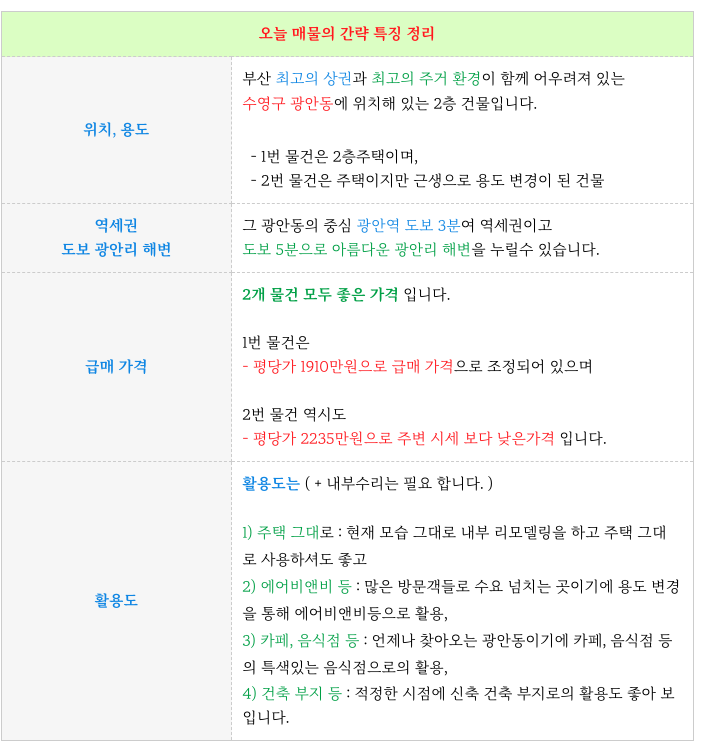 오늘 수영구 광안역 역세권 토지 넉넉한 2층 주택 매물 상세 제원 소개해 드립니다.
