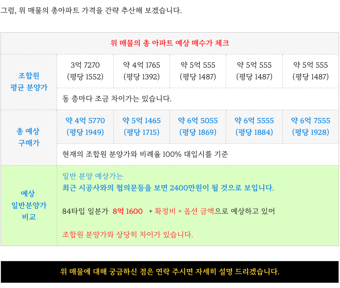 * 조합원 매물은 일반분양가 보다도 대단히 낮은 가격으로 상당히 매력입니다.