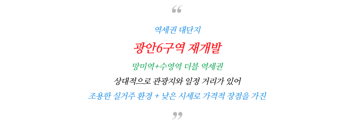 광안동의 관광지 지역과 일정 거리를 두고 있어 조용한 실거주환경을 가질수 있으며