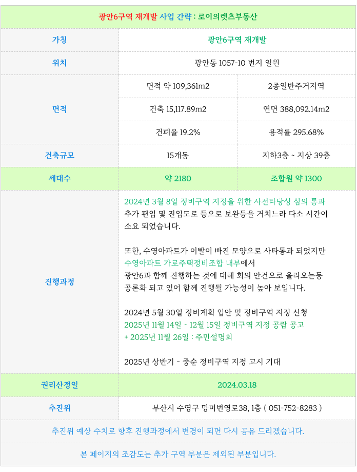 4. 추가적인 구역 상세 정보는 아래 페이지를 참고 부탁드립니다 : 광안6구역 재개발 :