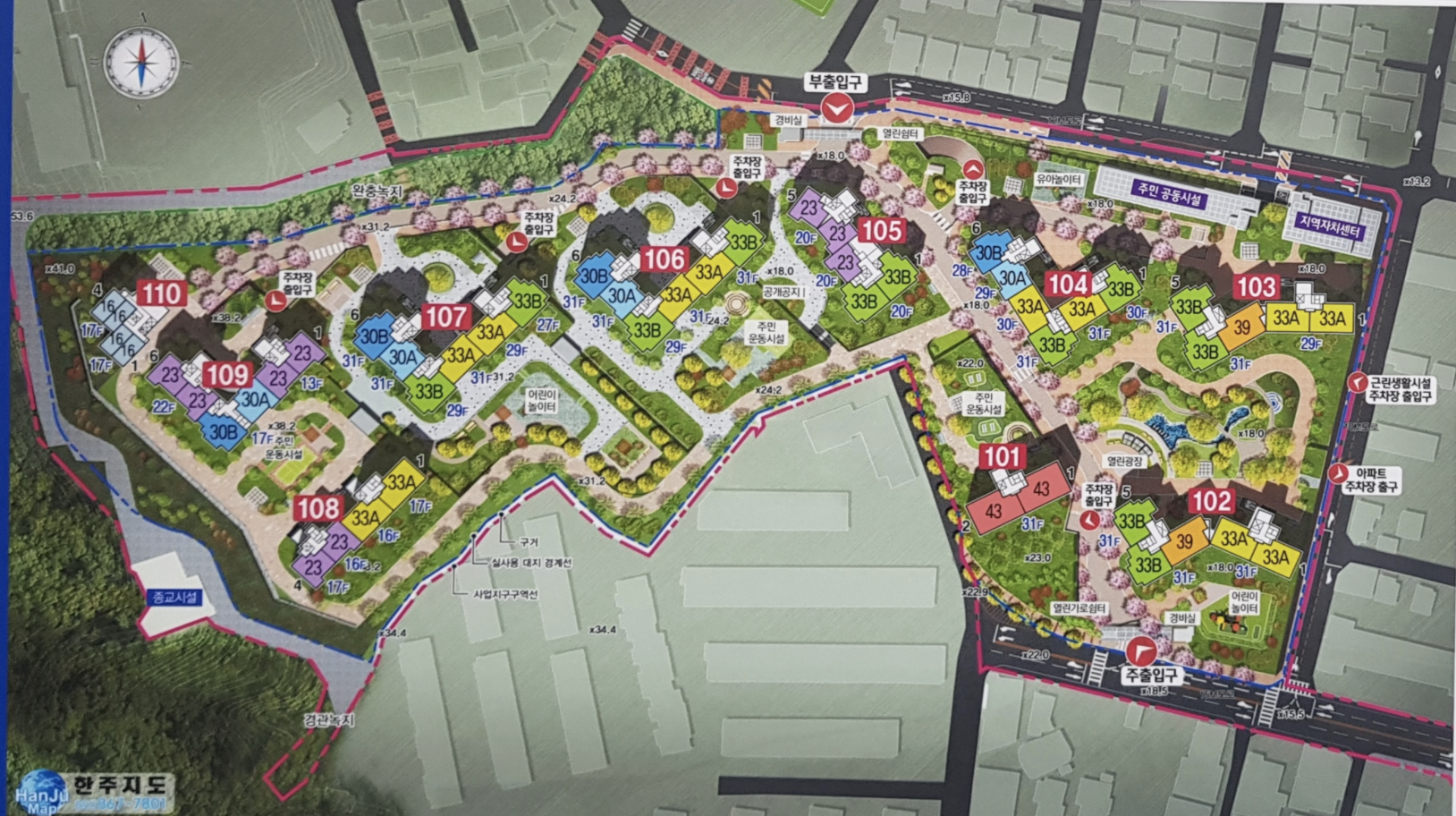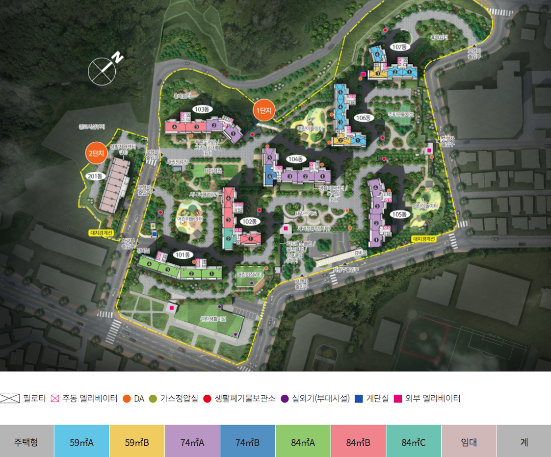 - 101동~104동까지는 단지의 앞쪽에 위치하여 고층의 경우는 조망과 지하철 접근이 용이하다는 장점을