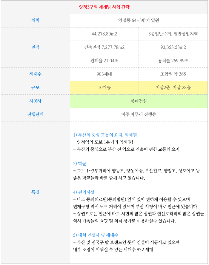 - 양정3구역 : 롯데건설, 세대수 903세대, 사업시행인가
